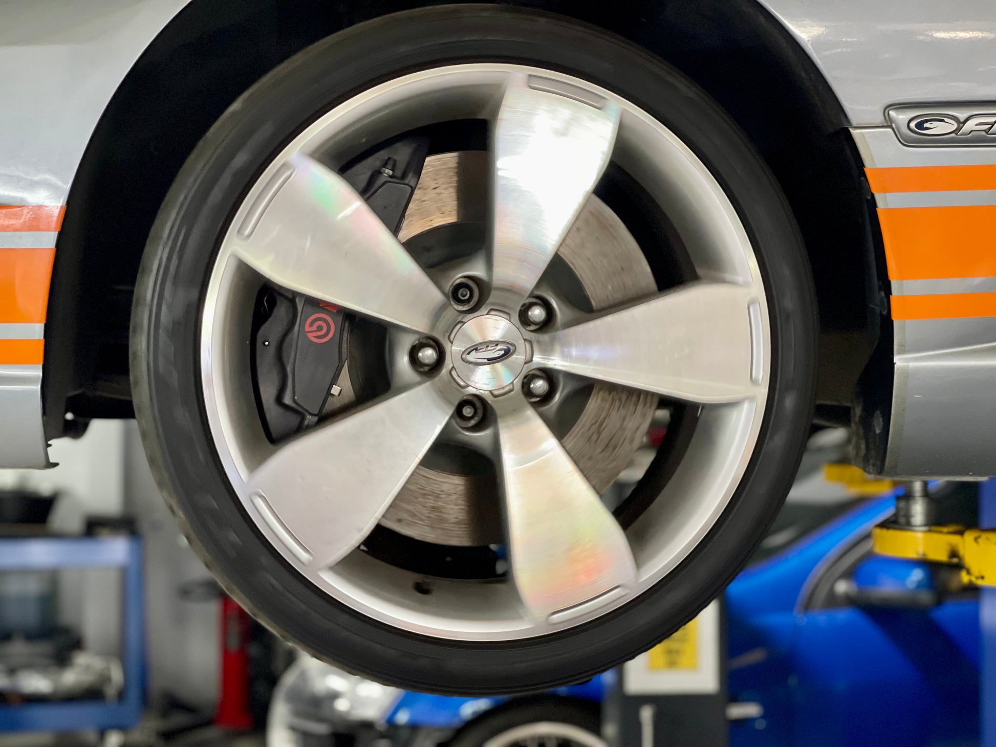 Falcon owners with this kit you can convert to S550 Mustang 6 piston Brembos and the Mustangs 380mm rotor to your car. This kit does increase the front wheel track 12mm overall. Each wheel mounting face is moved 6mm outwards with supplied spacer. As can be seen in the pictures, the caliper sits in the same forward position, and it just above center.