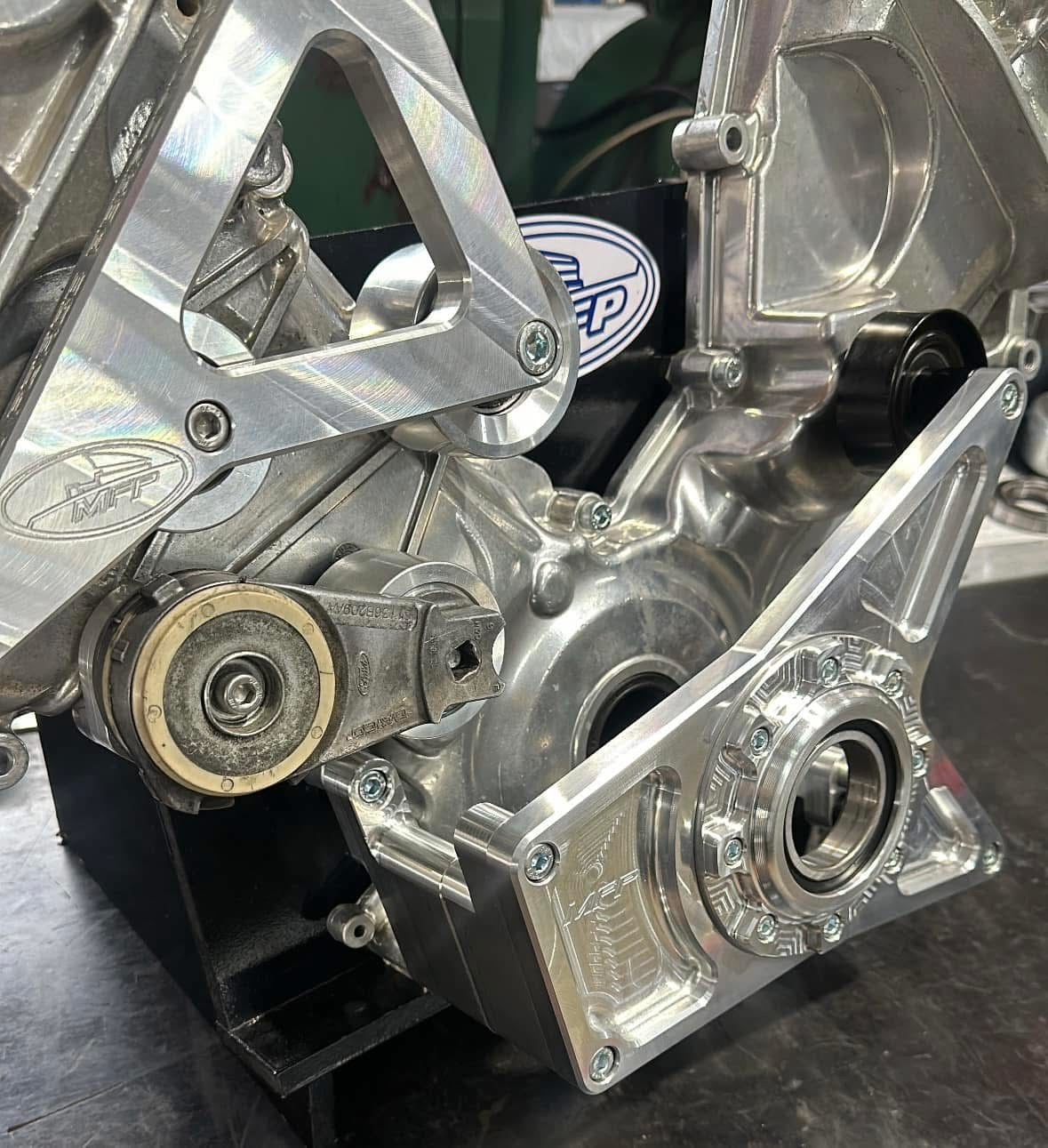 We come up with a solution in the Miami 5.0L Crank Support Kit. Made from billet 6961 billet aluminum with a high speed C3 rated bearing, this crank support system helps to minimize any flex or movement in the front of the crank to help prevent breakage. The aluminum plate installs onto the timing cover around the balancer using the included spacers and bolts. The balancer bolt slides through the large billet hub that will also sit inside of the balancer to help keep it from moving. This hub will replace the factory washer and then sits inside of a large, high-RPM-capable bearing attached to the billet aluminum plate. These act together to keep the crank in place and in one piece.
